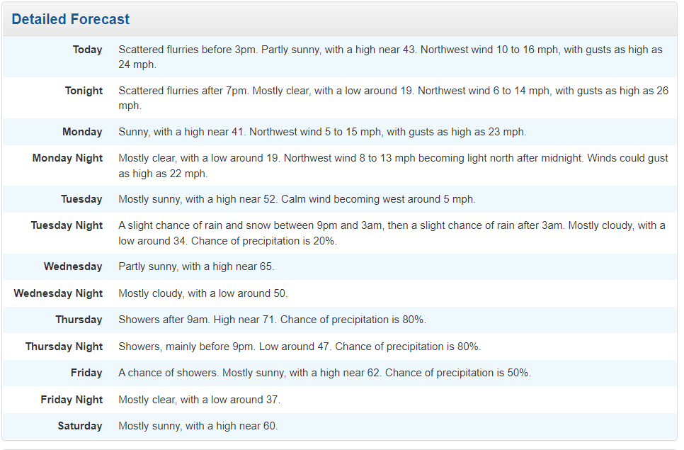 Spring in the Shenandoah Valley can be like a yo-yo. Temperatures up then down. And this forecast period is no exception. Your current forecast for the Shenandoah Valley below. Check out those temperatures for Sunday and Monday night...
